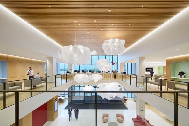 Атриум офиса с подвесными световыми инсталляциями UChicago Medicine Crown Point
